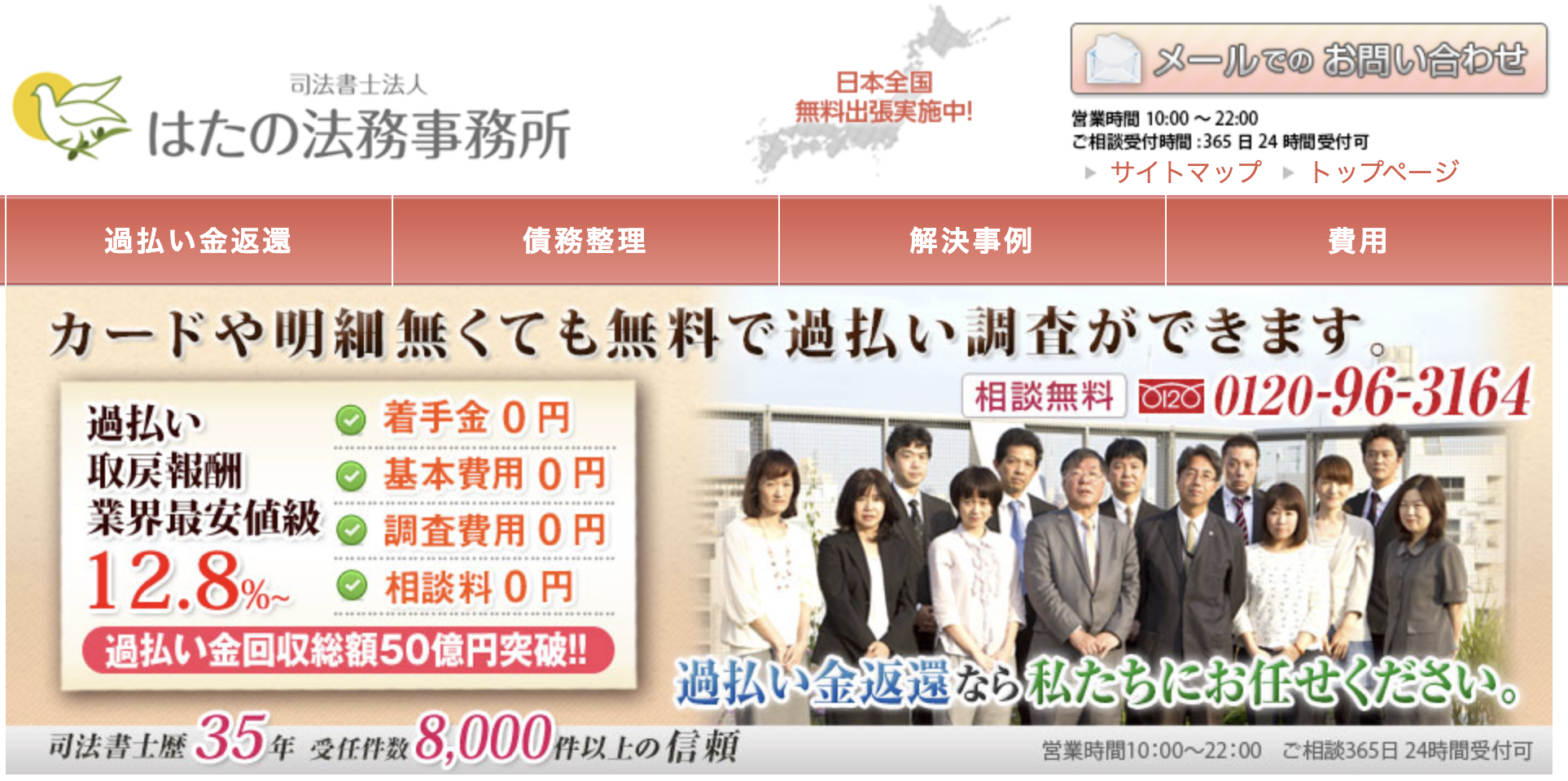 | 電話番号・対応時間 | (1)無料相談ダイヤル:0120-963-164・平日8:30~21:30 ・土日祝 8:30~21:00(2)ご依頼専用ダイヤル:03-5335-6450・平日10:00〜18:30 |