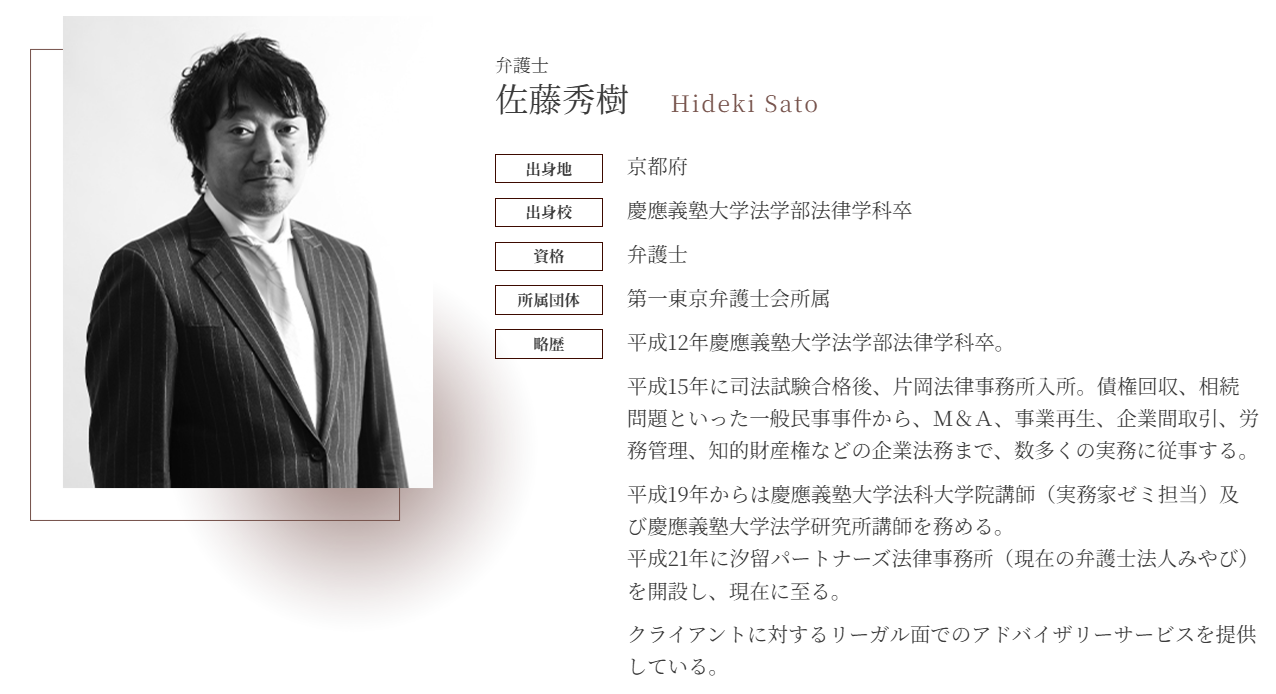 弁護士法人みやびの代表を務める佐藤秀樹弁護士は、豊富な経験と専門知識を活かし、多様な法律問題に対応しています。