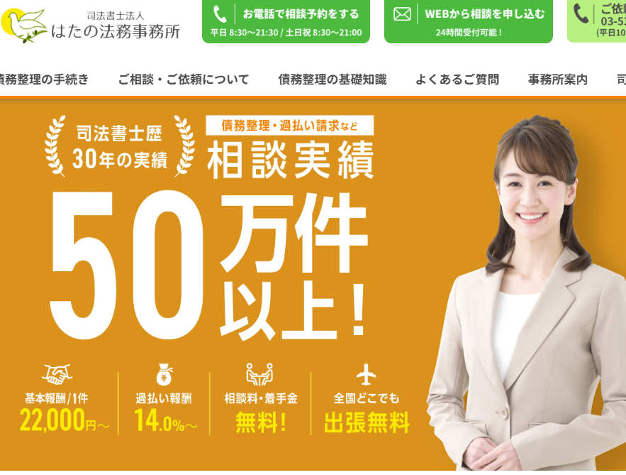 はたの法務事務所は、債務整理や過払い請求などの相談実績が50万件以上の法務事務所です。