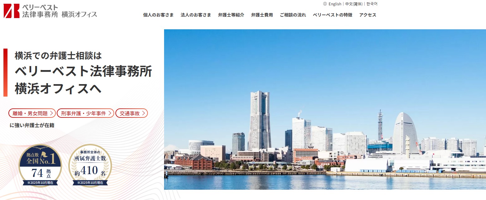 ベリーベスト法律事務所は、横浜をはじめ全国74拠点にオフィスがあり、全体で約410名の弁護士が在籍する法律事務所です。