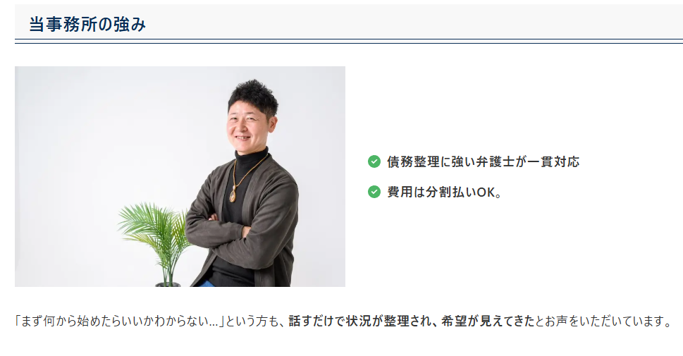 破産管財人の経験およびカウンセラー資格を持つ弁護士によるサポート体制は、金に悩む方が一歩を踏み出しやすい環境が整っている点が大きな魅力です。