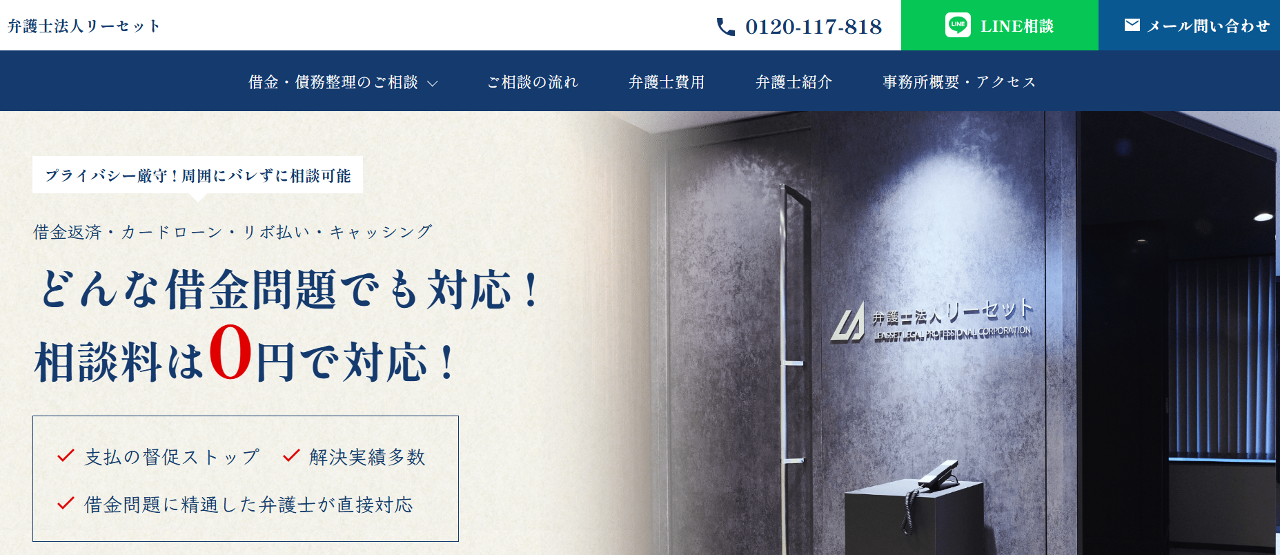 弁護士法人リーセットは、親身な対応と依頼者の気持ちや意向に沿った解決策の提示が高く評価されています。法的な論点だけでなく、依頼者の意向を最大限尊重する姿勢が特徴です。一方で、問い合わせへの返信がないという指摘もあるため、初回相談時の対応やレスポンスの速さもみて、依頼を検討することをおすすめします。債務整理専門の弁護士事務所で、相談料だけでなく着手金無料は嬉しいですね。